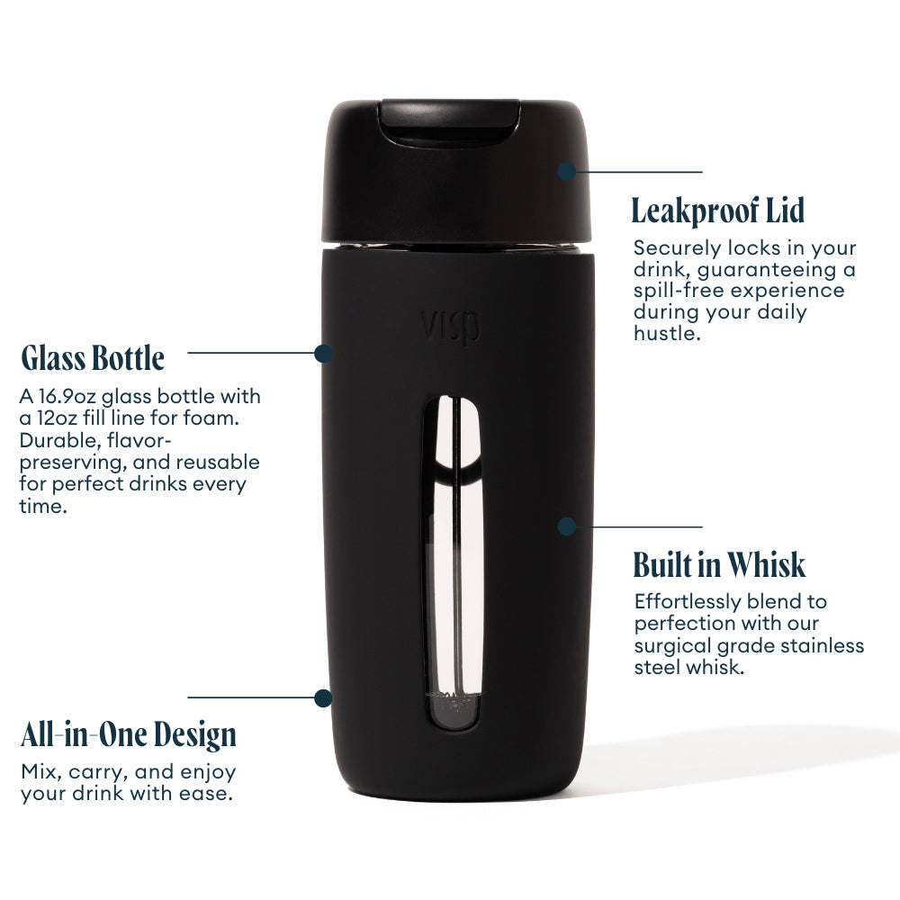 - Vessel Materials - Stainless Steel Whisk, Silicone Sleeve, Glass Bottle, BPA-Free Plastic