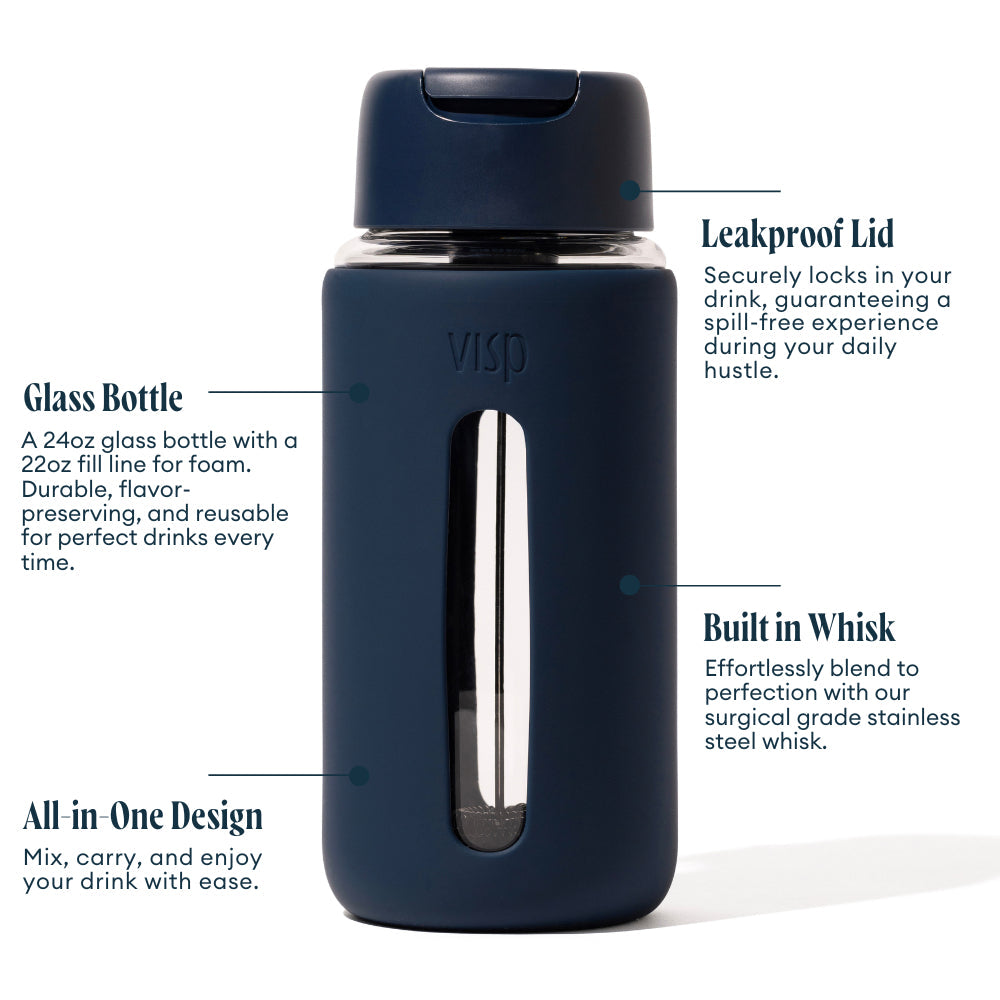 - Vessel Materials - Stainless Steel Whisk, Silicone Sleeve, Glass Bottle, BPA-Free Plastic